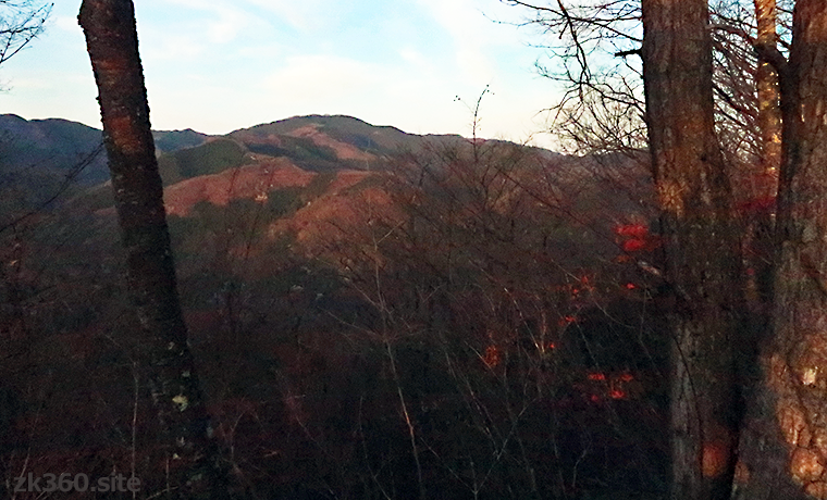 Photo 3: Mt. Jinba in the evening as seen from the summit of Mt. Takatori. Seen from the west, it looks like a rounded mountain. (2021/3/24)
