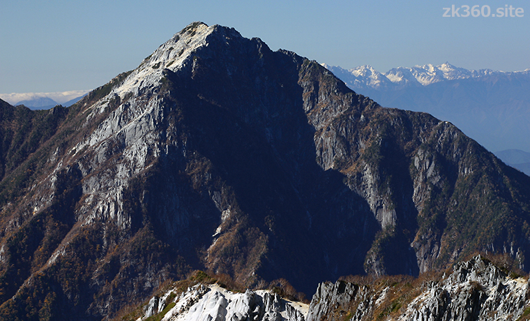 Photo 3: Mt. Kaikoma seen from near Jizo-dake in Houou-zan. The shape of the mountain stands out. The white mountains in the back are the Northern Alps. (2003/10/24)