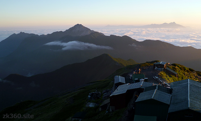 Photo 1: Mt. Kaikoma in the morning as seen from Kita-dake. The building on the lower right is kata-no-koya hut, and the mountains on the upper right are Yatsu-ga-take. (2017/8/2)