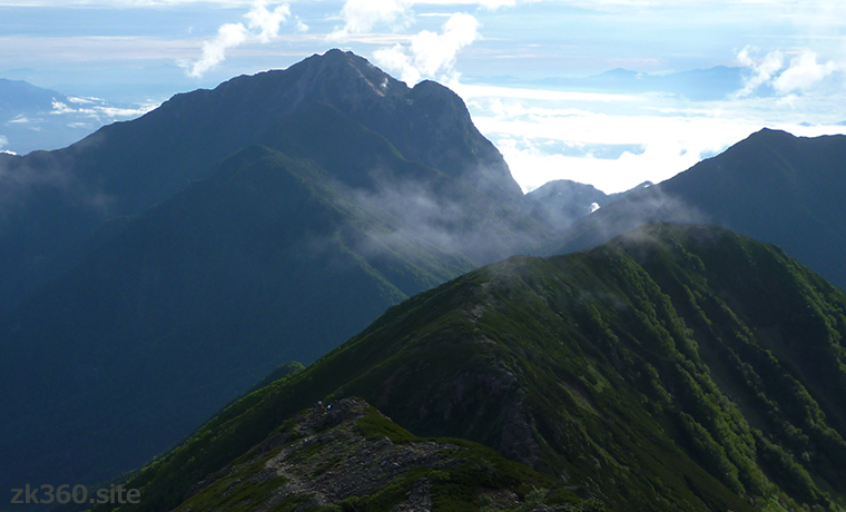 Photo 2: Mt. Kaikoma in the morning seen from the ridgeline between Senjo-ga-take and Ko-senjo-ga-take. The large mass on the right is called Marishiten. (2016/8/3)