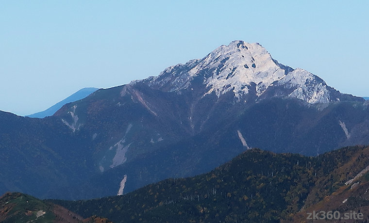 Photo 5: Mt. Kaikoma seen from Mt. Shiomi. The granite sand makes it look white as if it were covered with snow. And it is difficult to walk near the summit. (Photo: 2019/10/9)