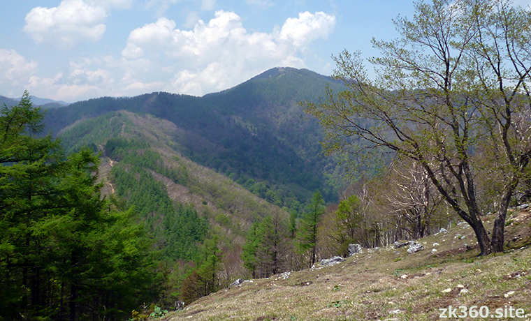 Photo 1: Mt. Kumotori in May seen from the summit of Mt. Nanatsuishi, which is known as the observatory of Mt. Kumotori. On the left side, where you can see the mountain trail is Ishione. (Photo: 2017/5/23)