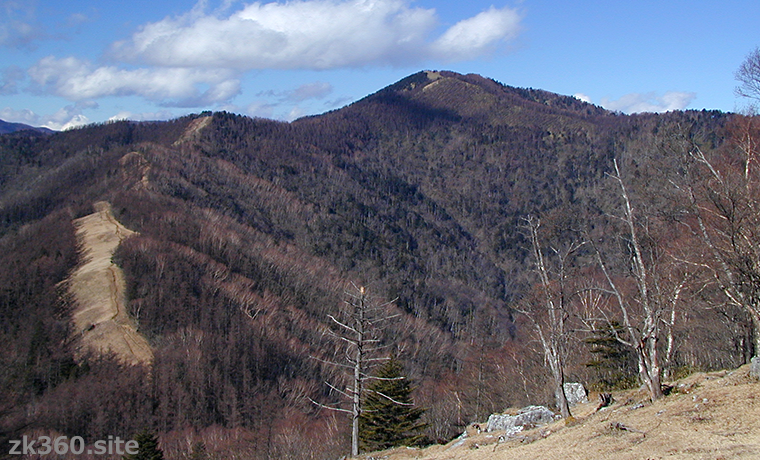 Photo 2: Mt. Kumotori in December seen from the summit of Mt. Nanatsuishi. Because the air is clear, both the shape of the mountain and Ishione can be seen clearly. (Photo: 2001/12/18)