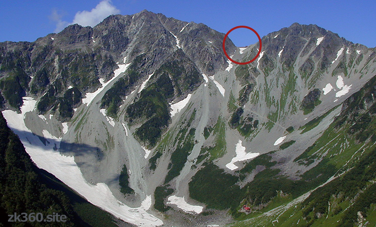 Photo 1: Mt. Oku-hotaka (left) and Mt. Karasawa (right) seen from the peak called “Byobu-no-mimi”. The place of the red circle is Shiradashi-no-col. (2000/8/22)