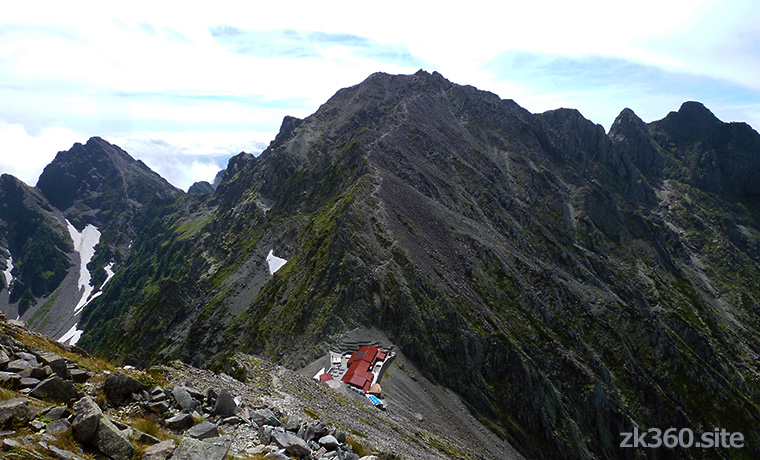 Photo 2: Overlooking Shiradashi-no-col from Mt. Karasawa. The building with red roof is a mountain lodge, and the large rock mass behind the lodge is Mt. Oku-hotaka. (2017/8/29)