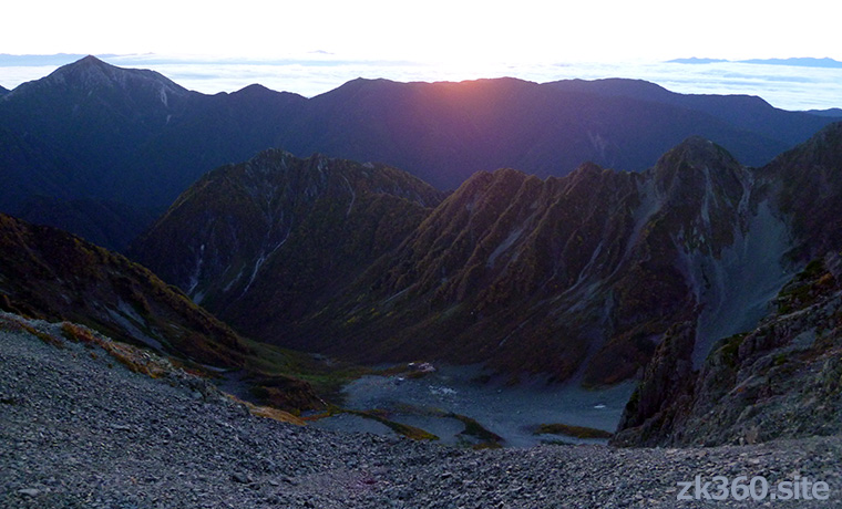 Photo 3: Karasawa cirque just before sunrise. The view of the mountains from Karasawa is beautiful, but the view from Shiradashi-no-col is more impressive. (2016/9/30)